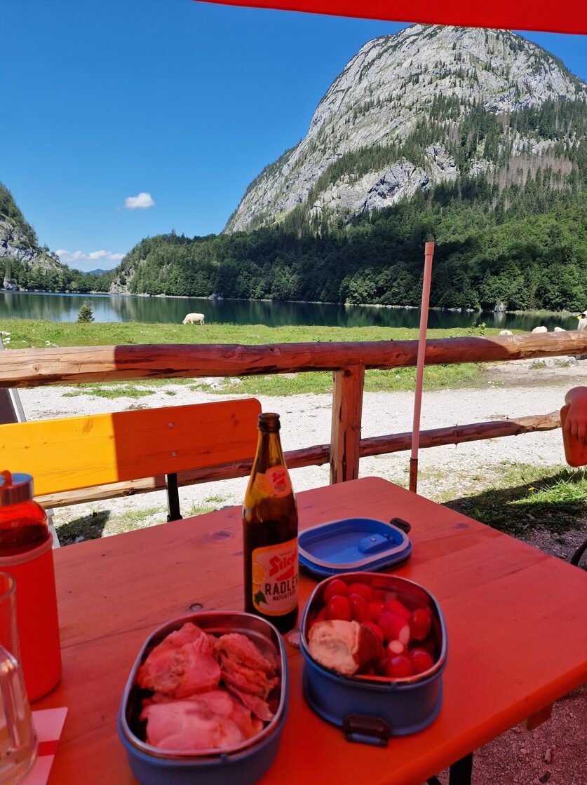 Alm am Hinteren Gosausee pasiekta! Žmonių labai daug, visi nori pavalgyti,